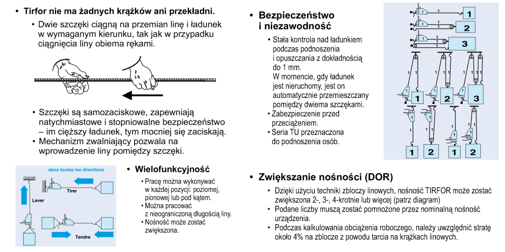 Przenośnie ręczne wciągniki z liną stalową Maxiflex® mogą być stosowane do podnoszenia, przeciągania i pozycjonowania ładunków na dużych odległościach w zależności od długości liny. Mogą pracować w różnych pozycjach i dlatego idealnie nadają się do profesjonalnych zastosowań; są obsługiwane z pomocą jednej dźwigni. Opcjonalnie istnieje możliwość zwiększenia udźwigu systemu Tirfor z wykorzystaniem zbloczy linowych.